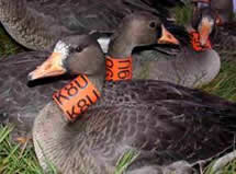 There is an ongoing long-term study of the geese, co-ordinated between the flyway states (the countries on their migration routes). At the wintering grounds, the geese are monitored via population counts, age census, and ringing. The data from the distinctive orange collars is used to track movements of individuals, site fidelity (how loyal they are to feeding or nesting grounds), and family relationships. The collar colour fades over time and the collars have no long-term side effects. Satellite telemetry has also been used to track the geese along their migration route to aid in identification and designation of important staging areas for the geese.